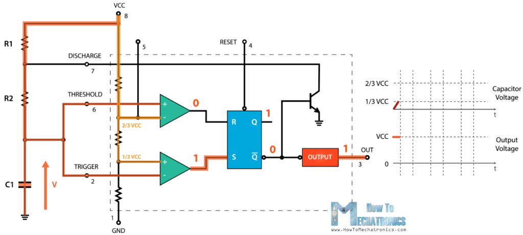 Once the voltage across the capacitor reaches 1/3 of the supplied voltage, the Trigger comparator will output 0 but at this point that won’t do any change as both R and S inputs of the flip-flop are 0. So the voltage across the capacitor will keep rising, and once it reaches 2/3 of the supplied voltage, the Threshold comparator will output 1 to the R input of the flip-flop. This will active the discharging transistor and now the capacitor will start discharging through the resistor R2 and the discharging transistor. At this moment the output of the 555 Timer is Low.