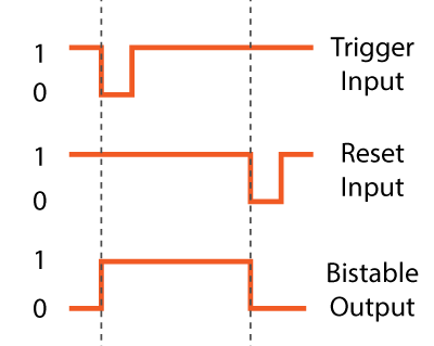 The output will remain high even when the trigger pushbutton is not pushed because in that case the flip-flop inputs R and S will be 0 which means that the flip-flop won’t change the previous state. For making the output Low we need press the Reset pushbutton, which resets the flip-flop and the entire IC.