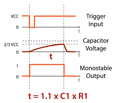 Next, let’s see how the 555 Timer works in a monostable mode. Here’s an example circuit.