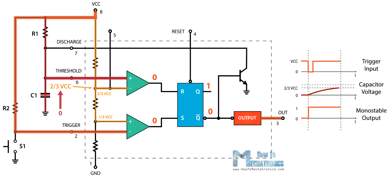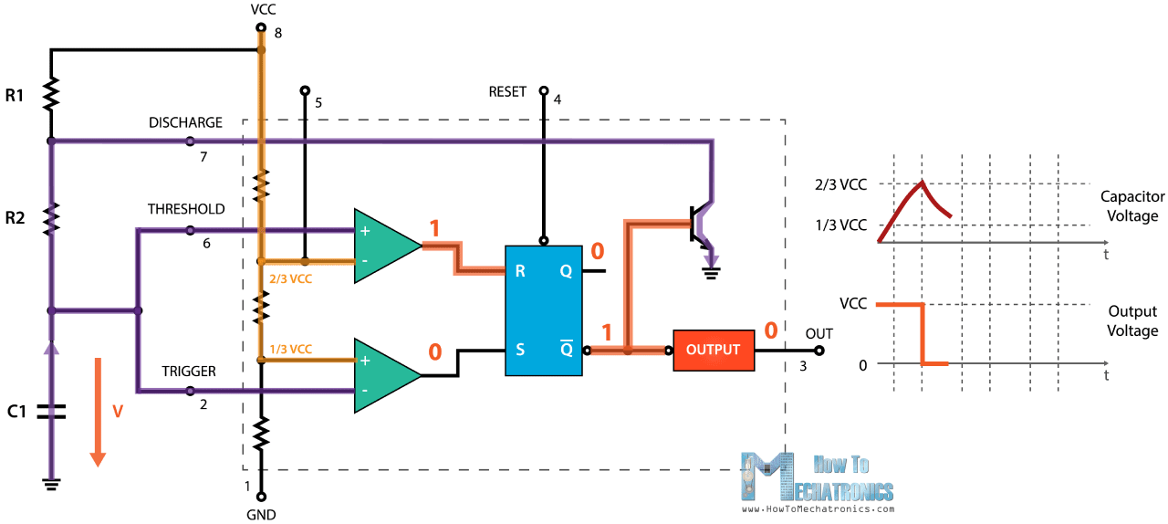 Once the voltage across the capacitor reaches 1/3 of the supplied voltage, the Trigger comparator will output 0 but at this point that won’t do any change as both R and S inputs of the flip-flop are 0. So the voltage across the capacitor will keep rising, and once it reaches 2/3 of the supplied voltage, the Threshold comparator will output 1 to the R input of the flip-flop. This will active the discharging transistor and now the capacitor will start discharging through the resistor R2 and the discharging transistor. At this moment the output of the 555 Timer is Low.
