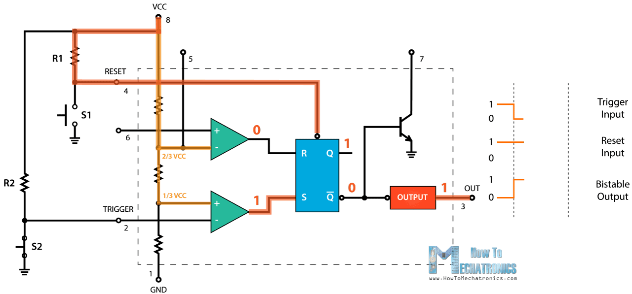On the other hand, the second comparator negative input terminal is connected to the “Trigger” pin, while the positive input terminal to the 1/3 reference voltage at the voltage divider.
