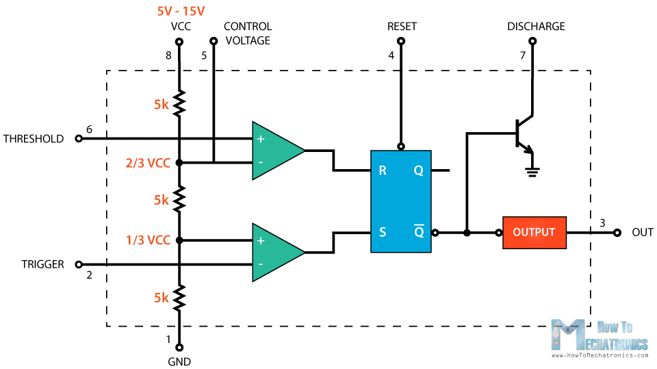 Represented with a block diagram it consists of 2 comparators, a flip-flop, a voltage divider, a discharge transistor and an output stage.