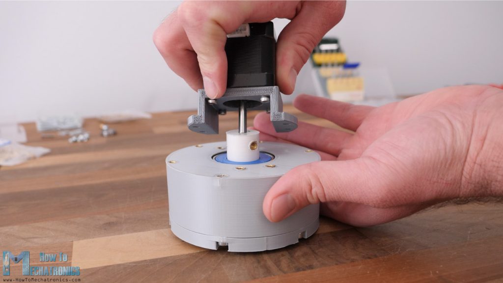 Lastly, we can attach the NEMA17 stepper with the help of this mounting bracket. Of course, we can change the input shaft coupler and the mounting bracket to fit with any other motor.