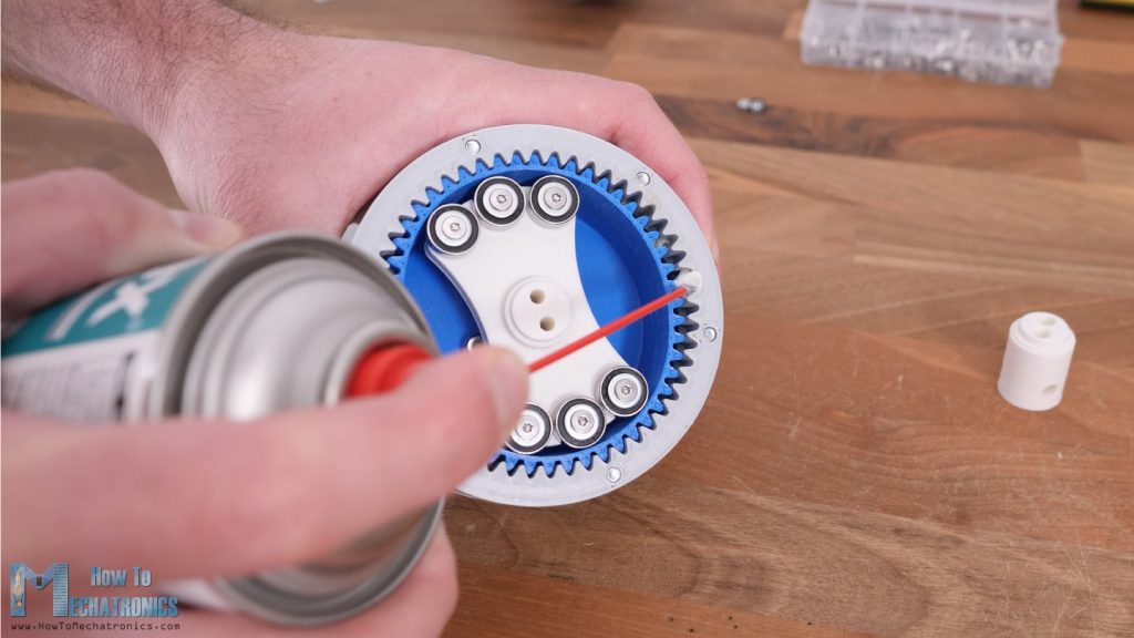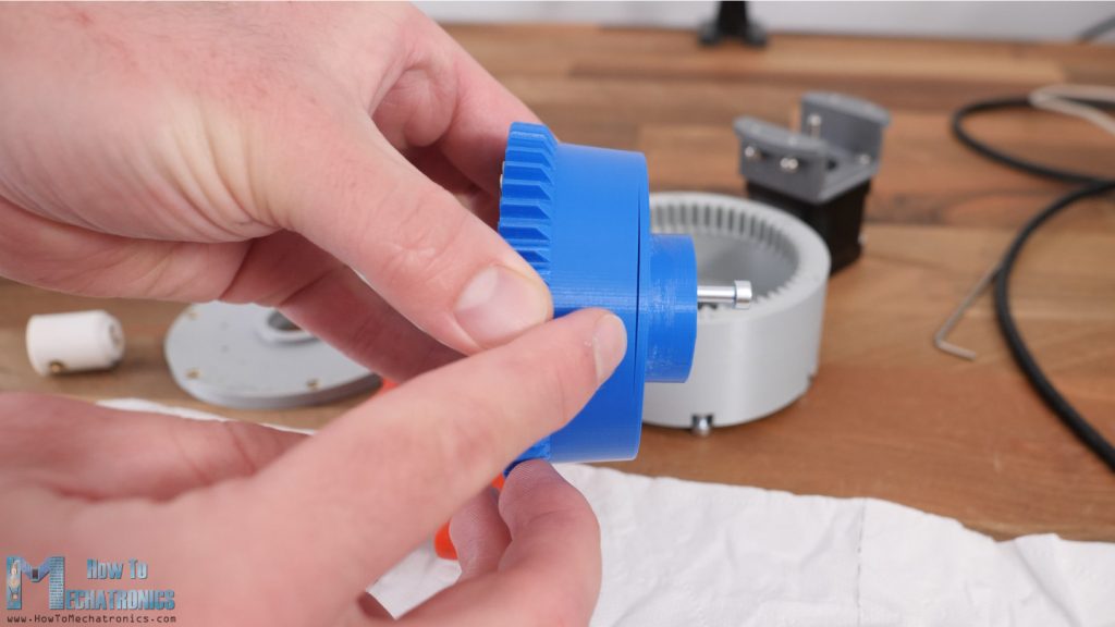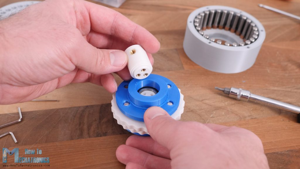 Actually, it’s much easier to first put the wave generator into the flex spline, and then put those two into the circular spline. At this point we can see how it works by moving the wave generator by hand, though we can notice that the movement is a bit jerky and we will see why a bit later.