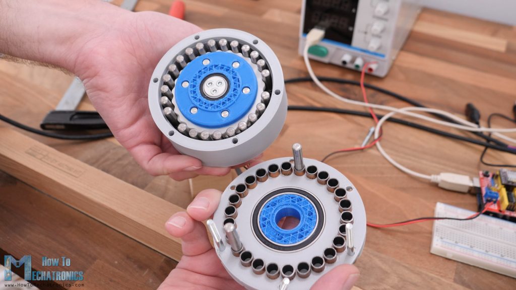 When assembling the cycloidal drive, the most crucial thing is to make sure that we place the two cycloidal disks 180 degrees out of phase.