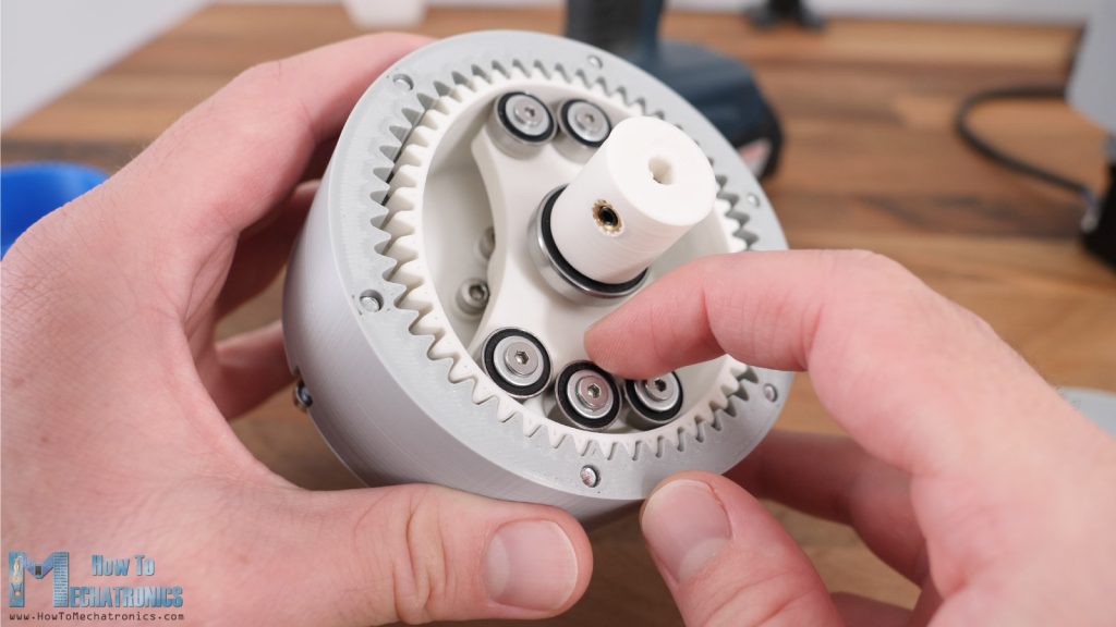 Once we place this sub-assembly into the gearbox, we can see the magic of the cycloidal drive and how it works.
