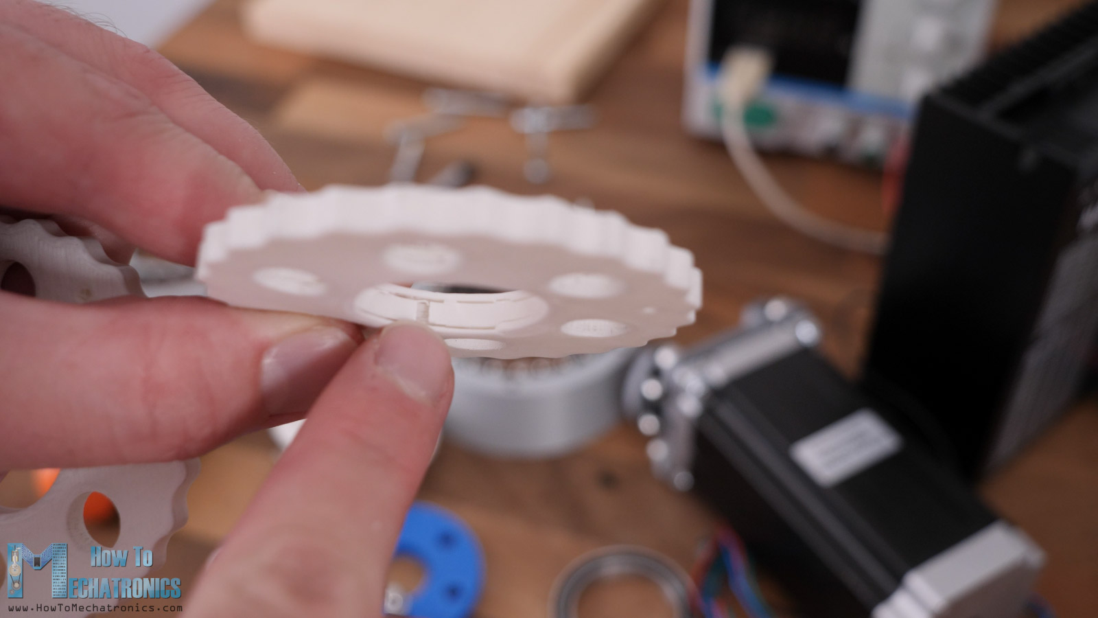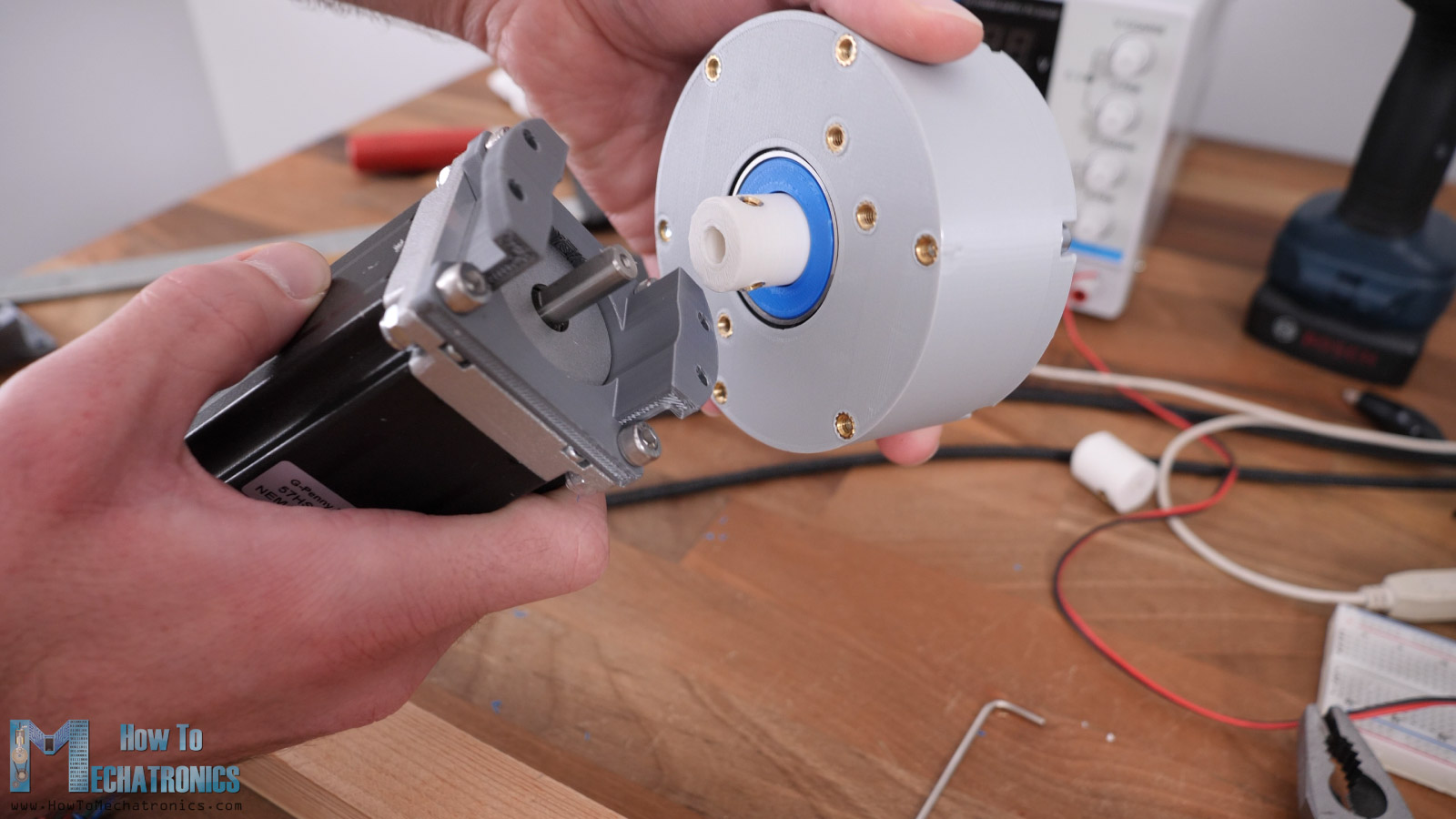 Lastly, we can attach the NEMA17 stepper with the help of this mounting bracket. Of course, we can change the input shaft coupler and the mounting bracket to fit with any other motor.