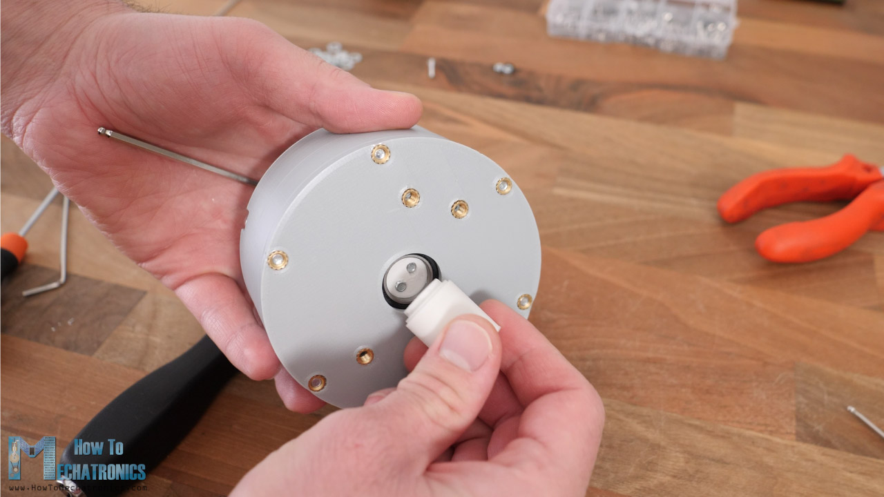 On the eccentric shaft we can attach and secure any input shaft coupler using tree M3 bolts. In this case I placed one for a NEMA 17 stepper motor.