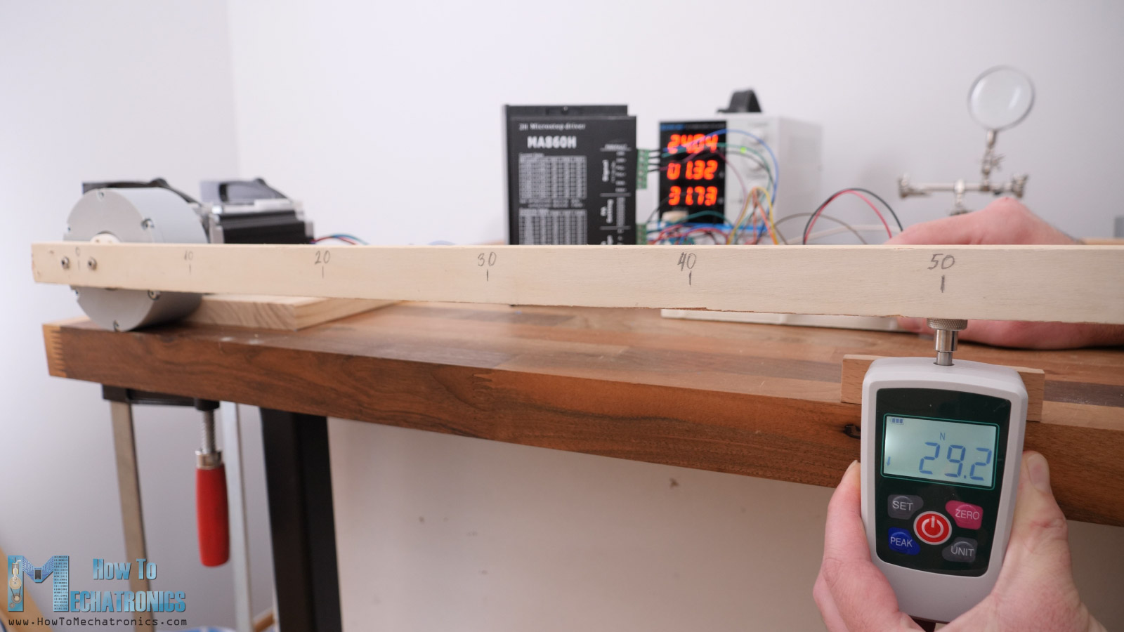 I replaced it with a stronger plywood stick and measured a of force of 30N at a distance 50cm. That’s a torque of 15Nm which is only 5 times higher than the 3Nm the stepper itself is producing.