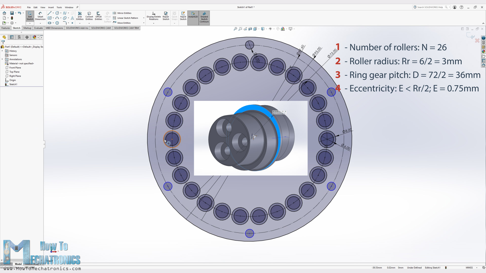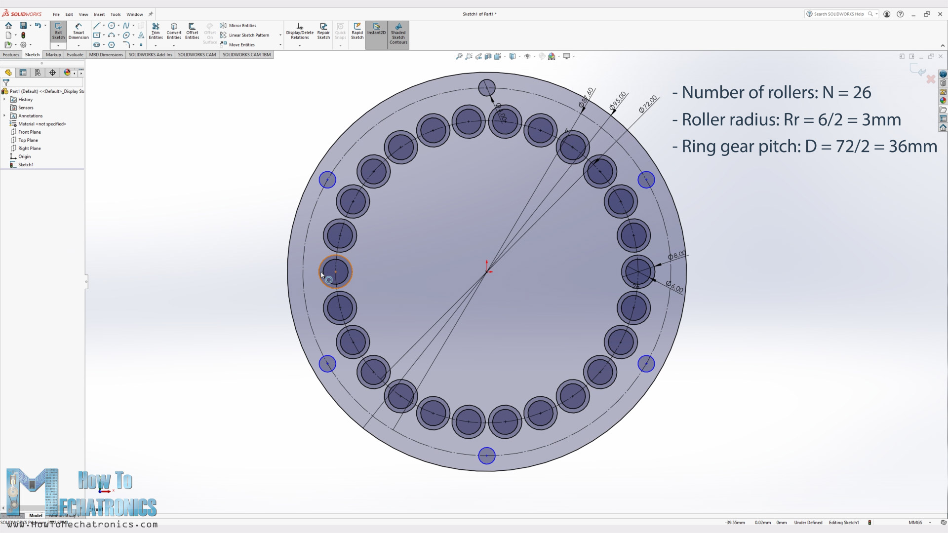 The base and first input parameter when designing these gearboxes was the size of the pins that I had for the rollers for the cycloidal drive ring gear. I had 6mm pins which I planned to put them in 8mm bushings in order to get smoother operation. So, I draw a sketch with 26 rollers and bushings with 8mm diameter.