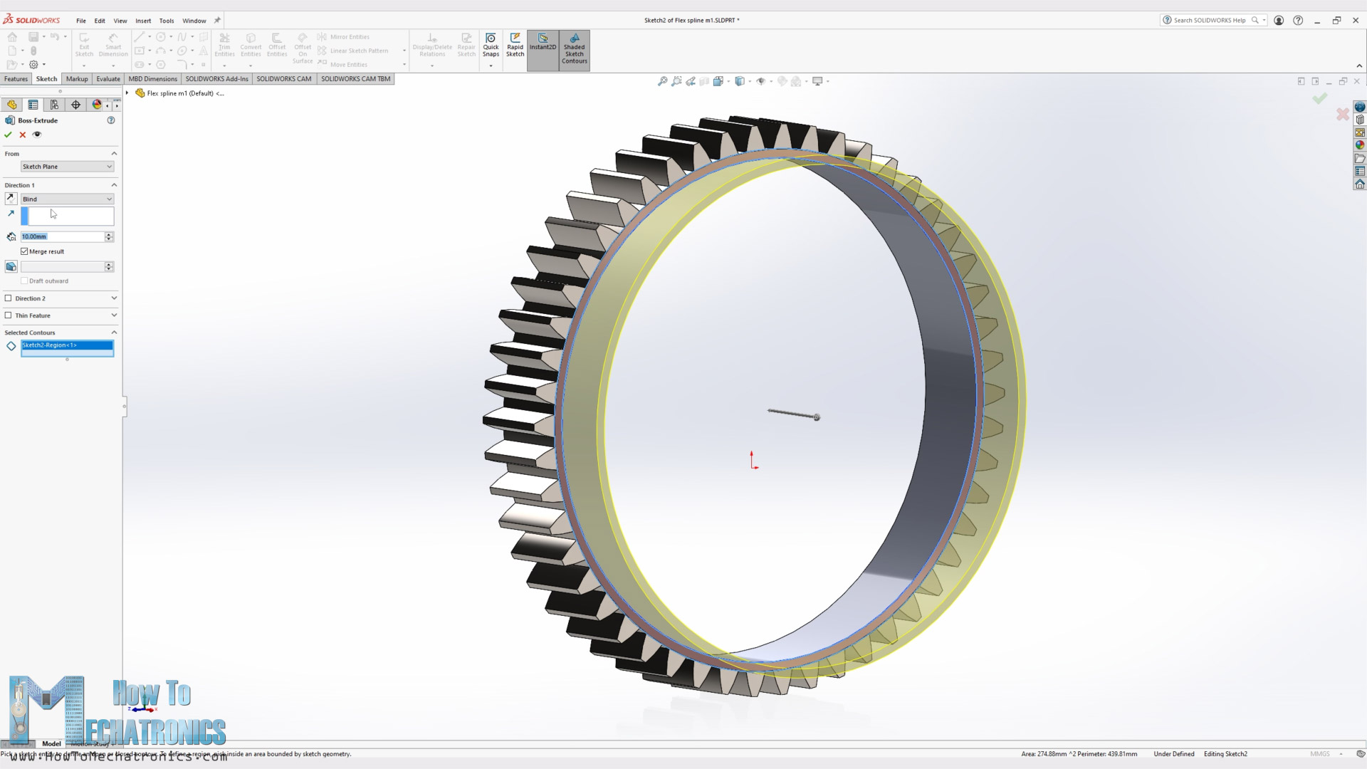 For designing the flex spline, I used the SOLIDWORKS Toolbox to generate a spur gear with 50 teeth. I chose a module of 1.5 which gave me a dimension suitable to match with the cycloidal gearbox. I saved it as a separate part file, and then started modifying it. I made the wall of the cup to be 1.25mm and the total length of the cup to 30mm.