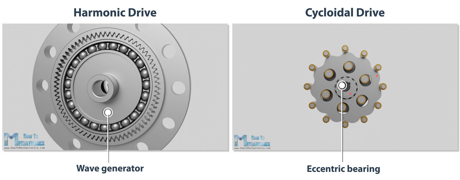 Real quick, both the harmonic and the cycloidal drive are unique type of gearboxes, or speed reducers that provide very high reduction ratio with compact but robust design. Their working principle is kind of similar, where their input shaft, drives a non-regular shape part, a wave generator in case of the harmonic drive, and an eccentric bearing in the case of the cycloidal drive.