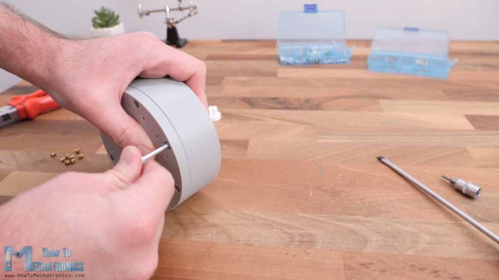 Now we can secure these pins to the other flange on the other side, but for that purpose first we need to install some threaded inserts into the flange. I’m using these threaded inserts in order the whole assembly to be more compact.