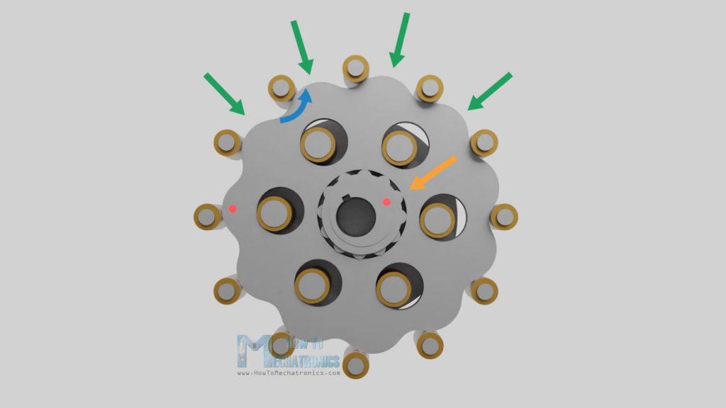 So, to recap the work of this gearbox, the input from the motor is transmitted to the eccentric input shaft which drivers the cycloidal disks around the gear ring.