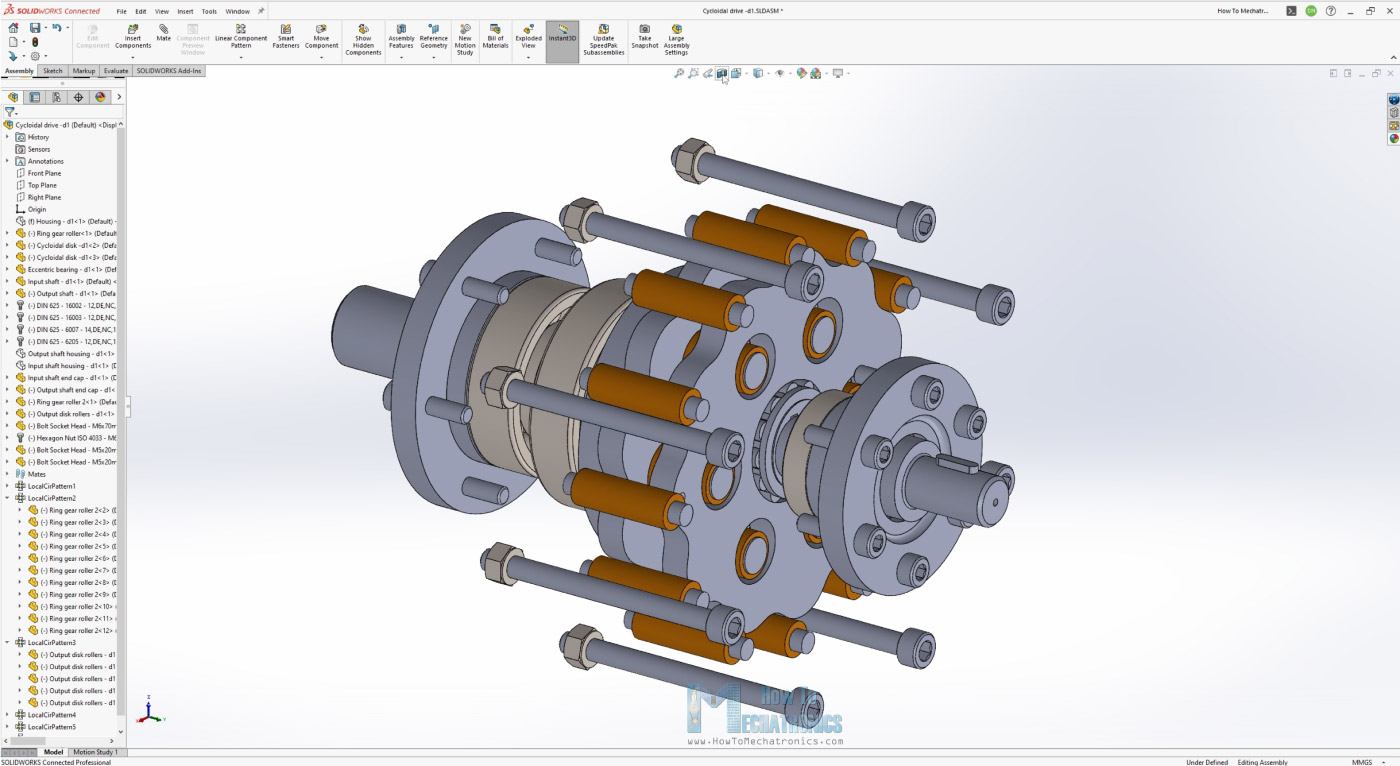 Here’s the cycloidal drive that I designed using SOLIDWORKS and uses ball bearings for the rollers.