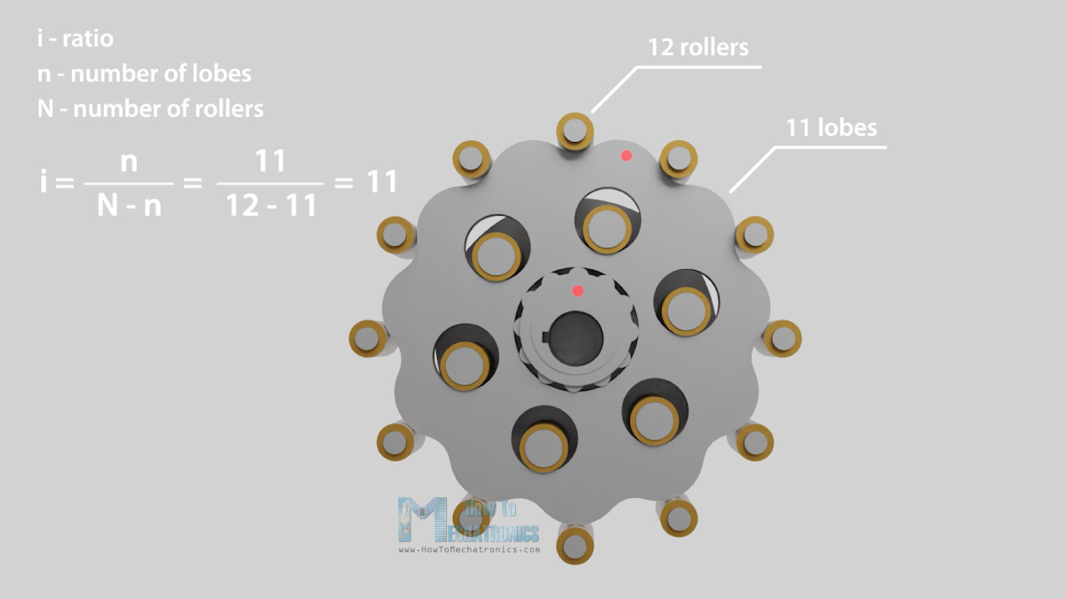 In general, there is one less cycloidal lobe on the disk compared to the number of pins on the ring gear housing. This makes, for one full rotation of the eccentric bearing, the cycloidal disk to move only a distance of one lobe. From this we can see that the reduction ratio depends solely on the number of pins of the ring gear.