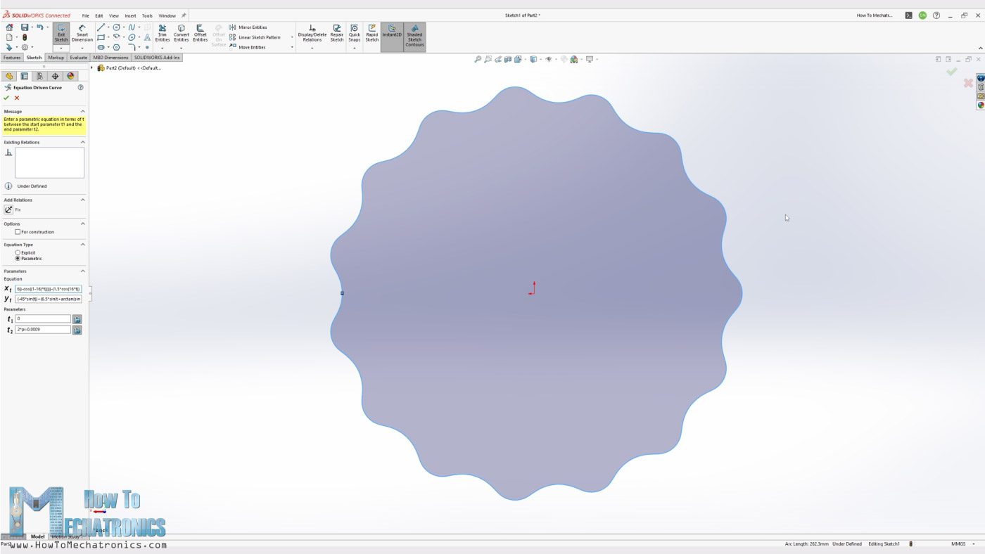 Now in order to generate the profile we can simply use the SOLIDWORKS’s Equations Driven Curve tool, insert the two equations appropriately and that will generate the cycloidal disk profile. Of course, for the input parameters we should insert our values.
