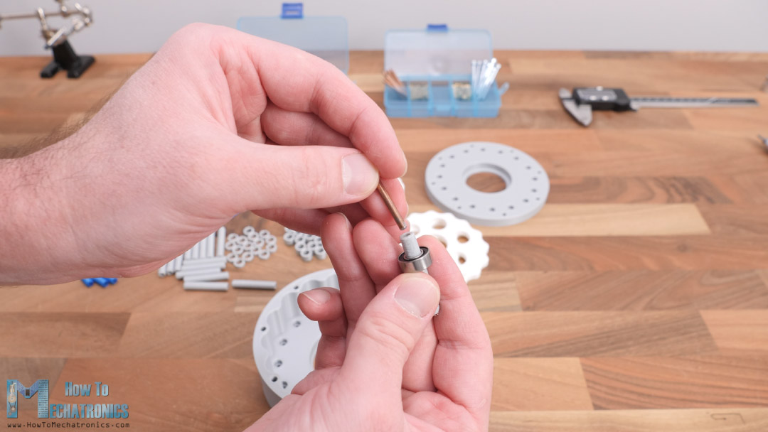 Next, we can assemble the input shaft which is made of four sections. In each section we need to place a bearing and some distance rings, and because of the eccentricity we won’t be able to do that unless the shaft is made in sections.
