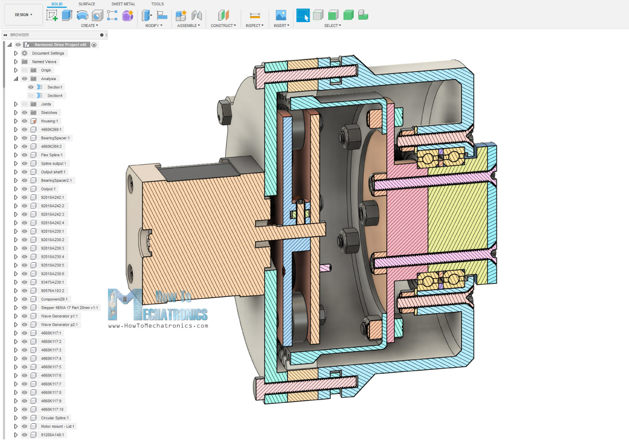 I designed this model of Strain Wave Gear using Fusion 360. All of these parts can be 3D printed, so we just need some bolts and nuts and some bearings to complete the assembly. As for input I chose to use a NEMA 17 stepper motor.