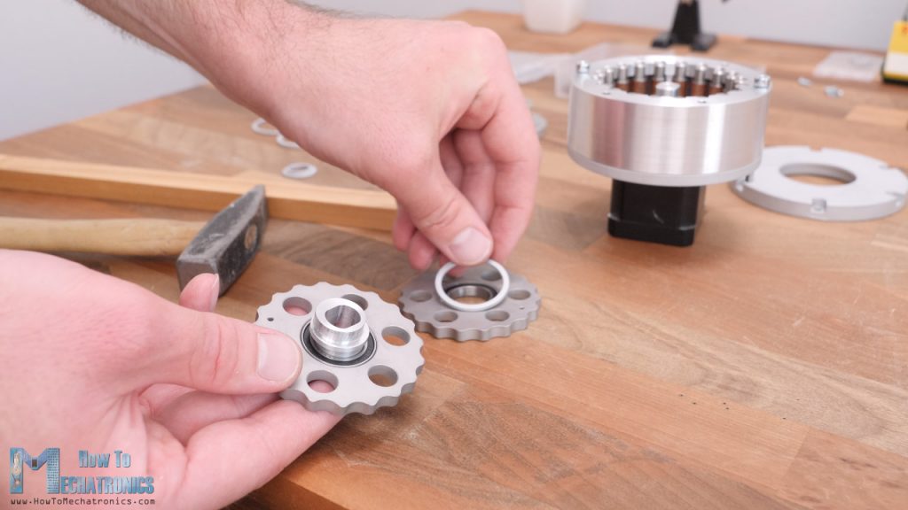 Before inserting the output shaft in place, we need to insert a distance ring and a bearing which will support both the input and the output shaft. Then we can just insert the output shaft into the cycloidal disks holes.