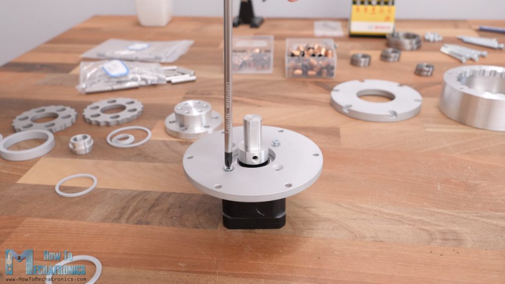 I started with securing the shaft coupler on the NEMA17 stepper motor. The shaft coupler should be at a distance of 2mm from the motor front plate, and we can easily secure it using two grub screws. Then we can secure the base plate to the stepper with four M3 bolts.