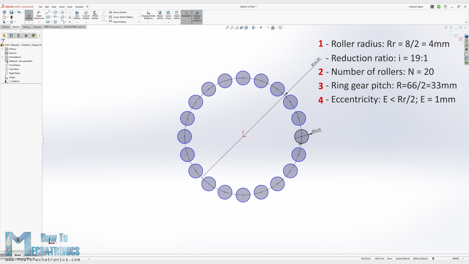 So, first I defined the diameter of the rollers to be 8mm, as that was the dimension of the bushings I could order easily. Then I wanted to have 19:1 reduction ratio, which meant that the ring housing needed to have 20 rollers. So, I draw a sketch with these 20 rollers with 8mm diameter around circle.