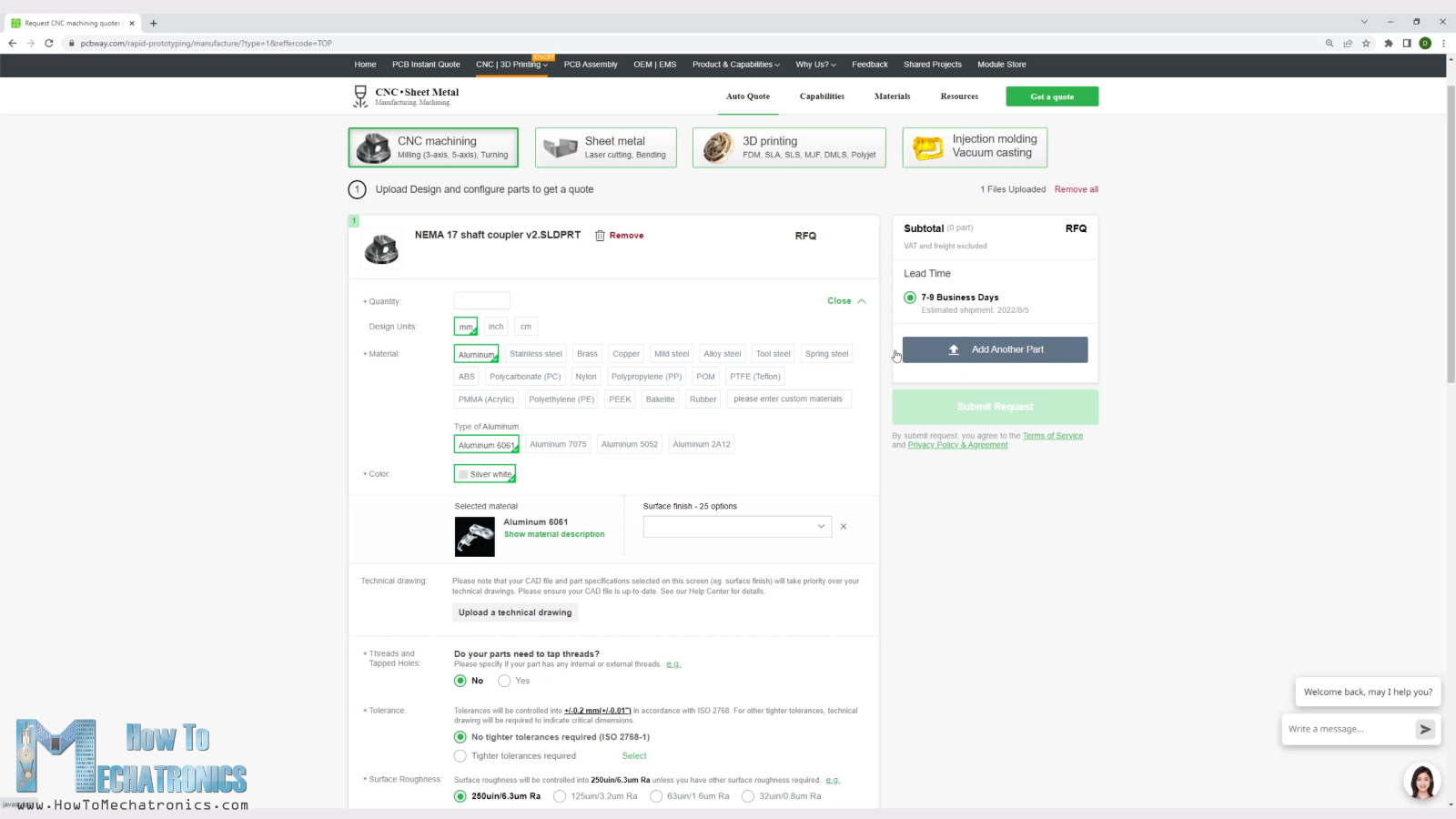 Ordering the parts is super easy. We just have to upload the 3D model and select the material for the part. They have pretty much any material available. I chose Aluminum for most of the parts, except for the cycloidal disks which I wanted to be made out of stronger material, so I chose stainless steel for them.