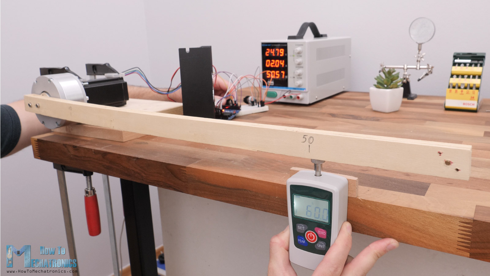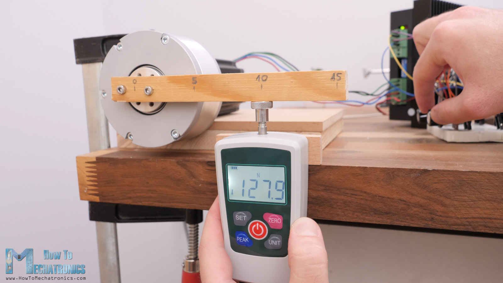 I initially started the test with the same 10cm stick that I already used, but I soon realized that I needed a longer one, as at just around 25% of the stepper motor power I already reached 130N at 10cm, and my Force meter can measure maximum of 200N. So, I had to increase the distance at which I measure the force in order to stay under 200N.