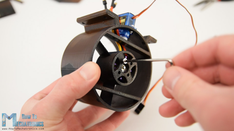 I started with installing the servo motor which controls the rudders onto the thrust blower housing. I secured the servo using two M2 bolts and nuts.