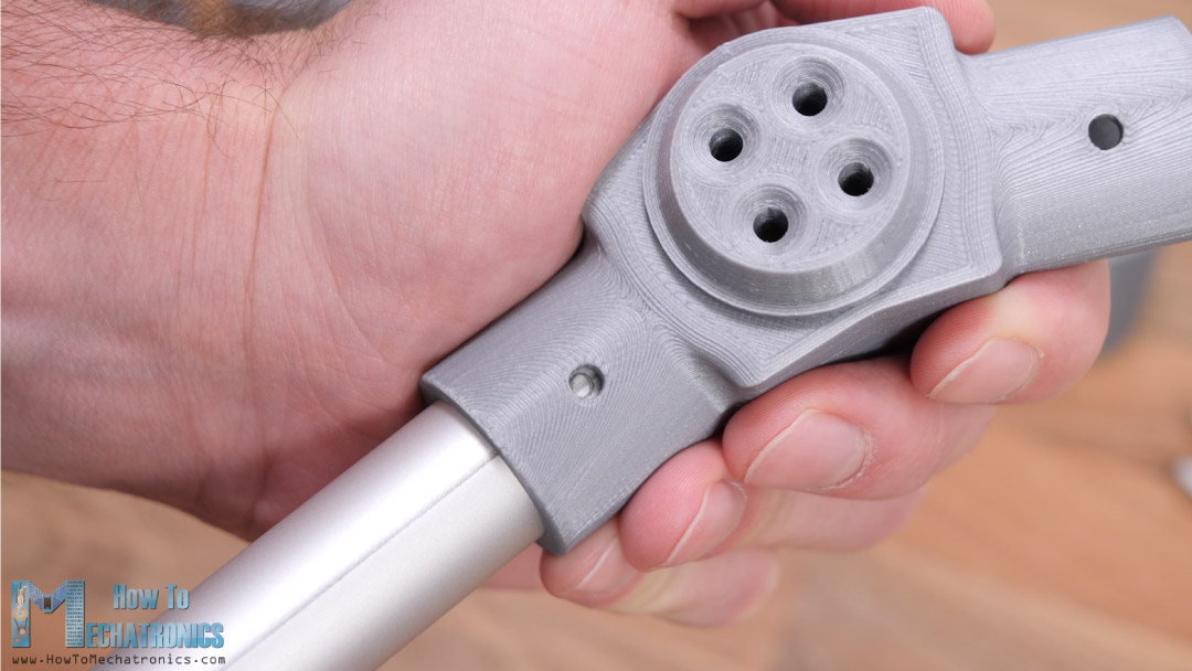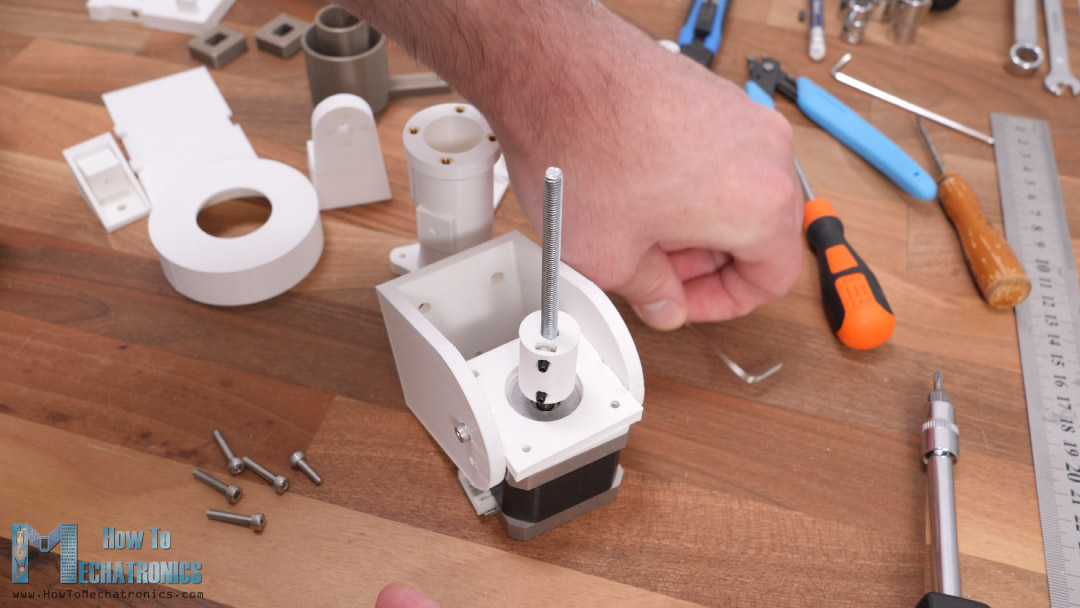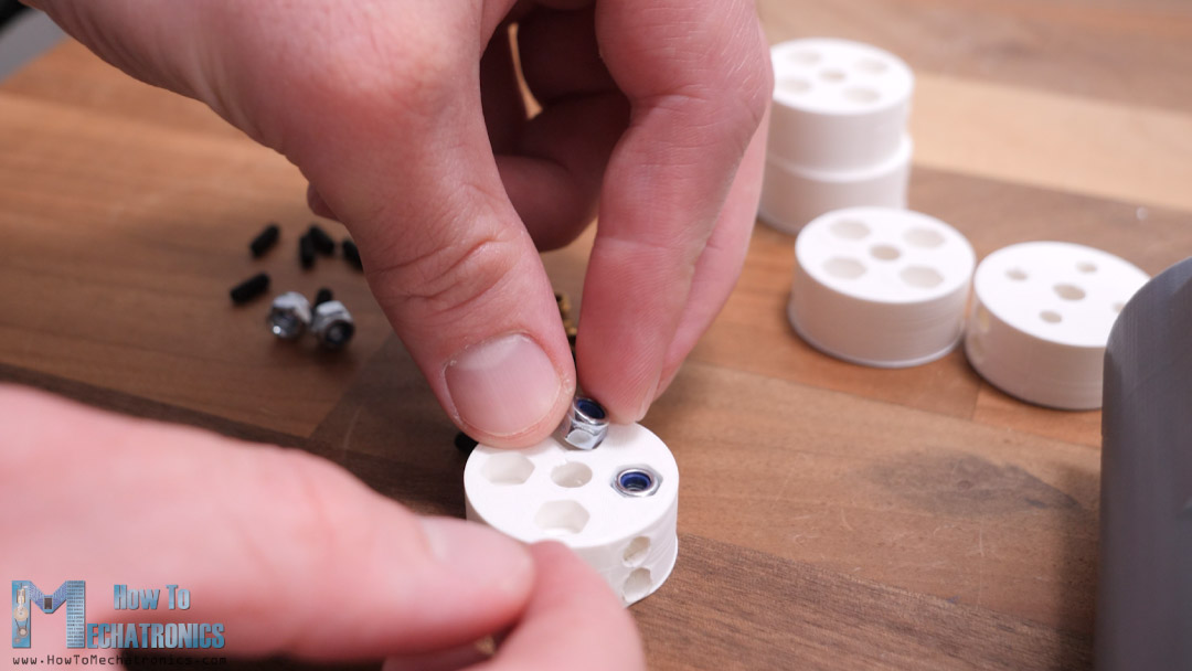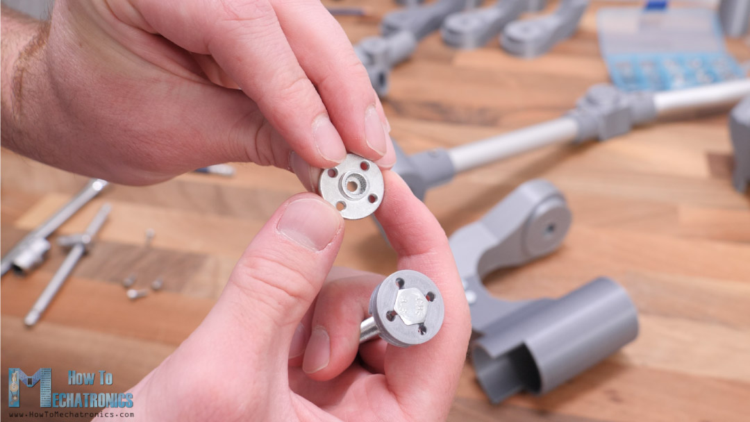 At the top side or the head of the bolt we need to attach a servo horn and we do that with the help of this 3D printed coupler and some M3 bolts.