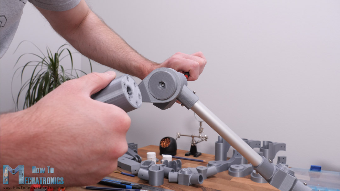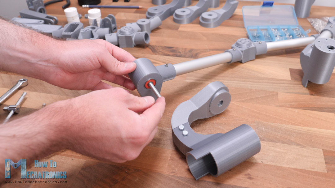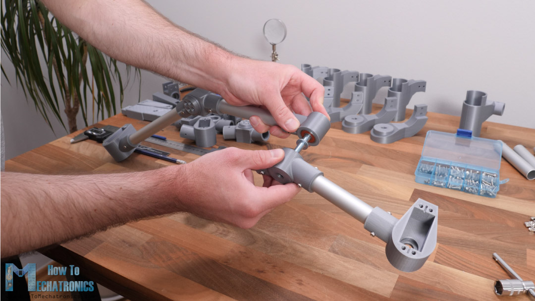 For the actual joint or the connection between the servo mount part and the DC motor mount part we use two bearings and an M6 bolt.