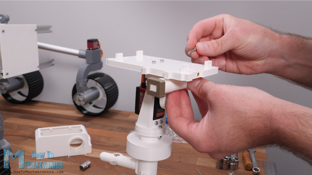 Once we complete the rocker-bogie suspension arrangement we can continue with assembling the steering wheel joints. The steering wheel joint part is composed of two parts bolted together.