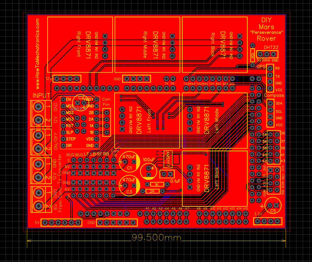 For controlling the rover, I’m using a cheap commercial RC Transmitter which sends commands to the rover. At the rover I have suitable RC receiver which receives the commands and sends them to an Arduino board. Yes, the brain of this Mars rover is actually an Arduino MEGA board and for easily connecting everything together I made a custom PCB which can be simply attached on top of the Arduino MEGA board.