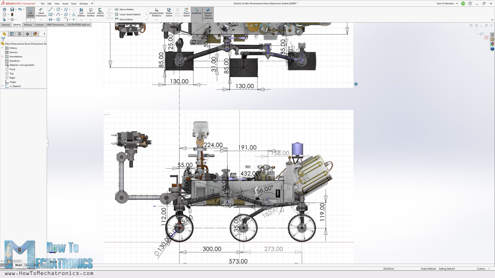 I took 3 pictures of the front, top, and side view of the rover and imported them in Solidworks. I wanted the size of the wheels to be 130mm in diameter, so I scaled the pictures according to this dimension.