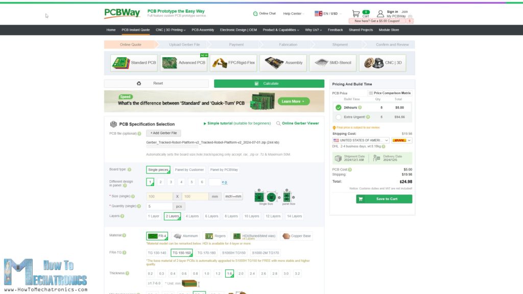 I ordered the PCB from PCBWay. Here we can simply upload the Gerber file, choose the properties of our PCB, and order it at a reasonable price.