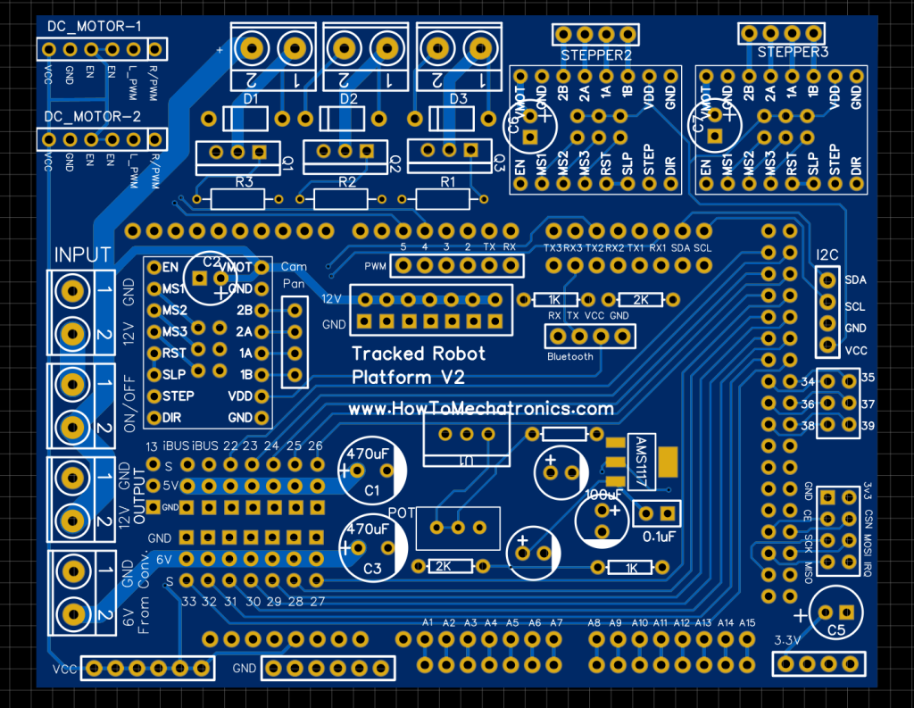 In order to keep the electronics components organized, I designed a custom PCB for the RC tank. The PCB will be compatible with the ATmega2560 microcontroller-based board to be directly mounted on top of it.