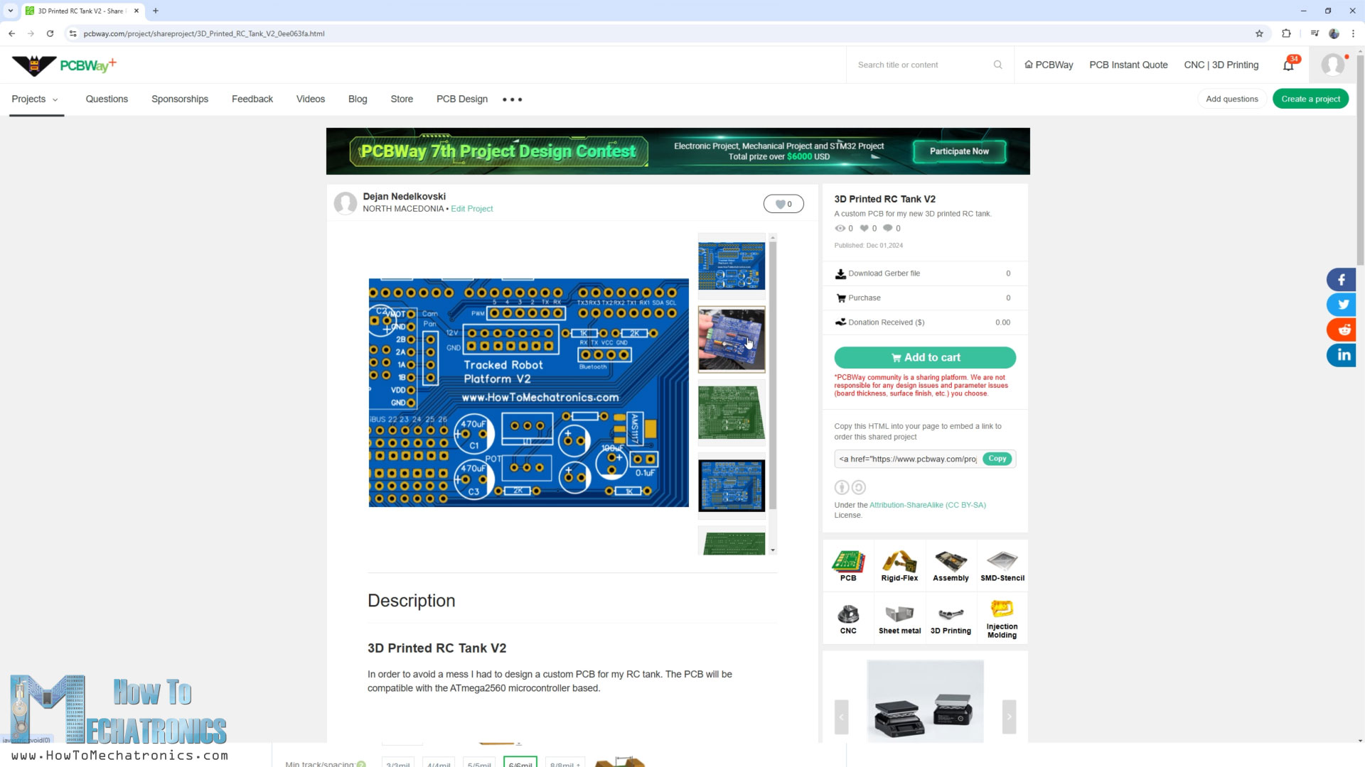 I didn’t change any of the default properties except for the PCB color which I chose to be blue. You can find and download the Gerber from the PCBWay projects sharing community through which you can also directly order the PCB.