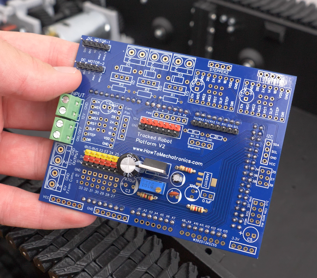 At the tank, there is a suitable RC receiver which receives the commands and sends them to a microcontroller. The brain of this platform is an Atmega2560 microcontroller-based board and for easily connecting everything together I made a custom PCB which can be simply attached on top of the board.
