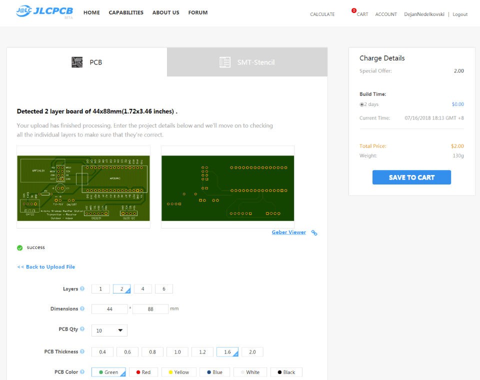Here we can simply drag and drop the Gerber file and once uploaded we can review our PCB in the Gerber viewer. If everything is all right then we can go on, select the properties that we want for our PCB, and then we can order our PCB at a reasonable price. Note that if it’s your first order from JLCPCB, you can get up to 10 PCBs for only $2.