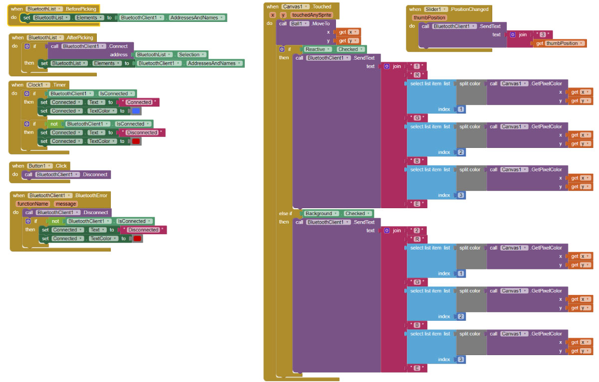 If we take a look at blocks of the app, we can see what happens when we touch the canvas where the color palette image is placed. Using the .GetPixelColor blocks we get the Red, Green and Blue values for the picked up color and using the Bluetooth SendText block we send this information to the Arduino in a form of text.