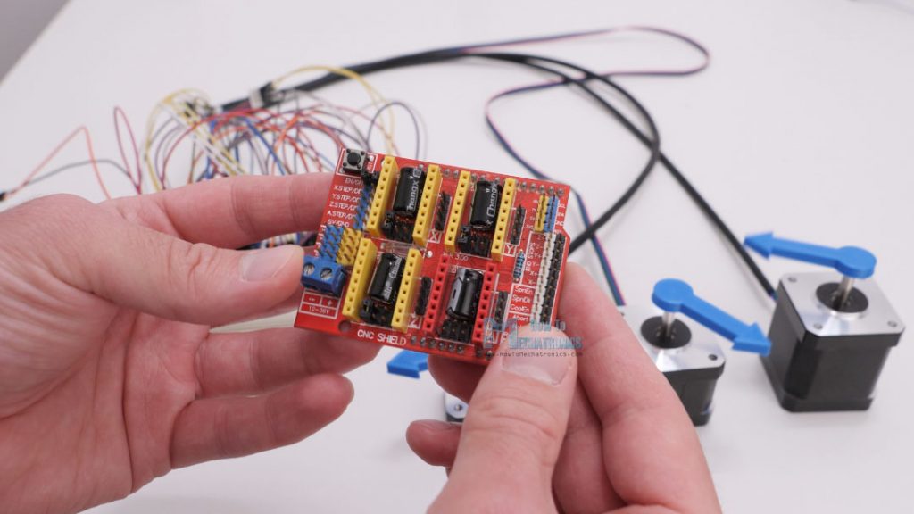 The main purpose of the Arduino CNC shield is for controlling 2 or 3-axis CNC machines, but it is actually a great option for controlling any type of project where we need to control multiple stepper motors as it is compact and provides easy connections for the drivers and the motors.