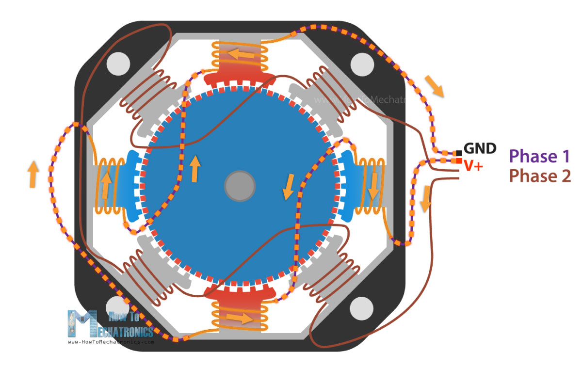 I mentioned that the stator coils are organized in two phases, and we can also notice that if we take a look at number of wires of a stepper motor. It has 4 four wires, two for each phase. The four different magnetic field orientations are possible as we can let current flow through the phases in both directions.