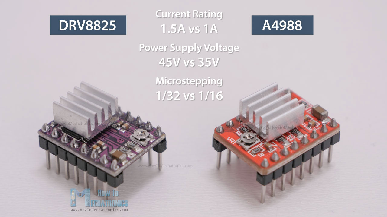 The DRV8825 is a stepper driver by Texas Instruments which can be used as direct replacement for the Allegro A4988 driver as their connections are the same. The three key differences between them are that the DR8825 can deliver more current than the A4988 without additional cooling (1.5A vs 1A), it has higher maximum supply voltage (45V vs 35V), and it offers higher microstepping resolution (32 vs 16 microsteps).