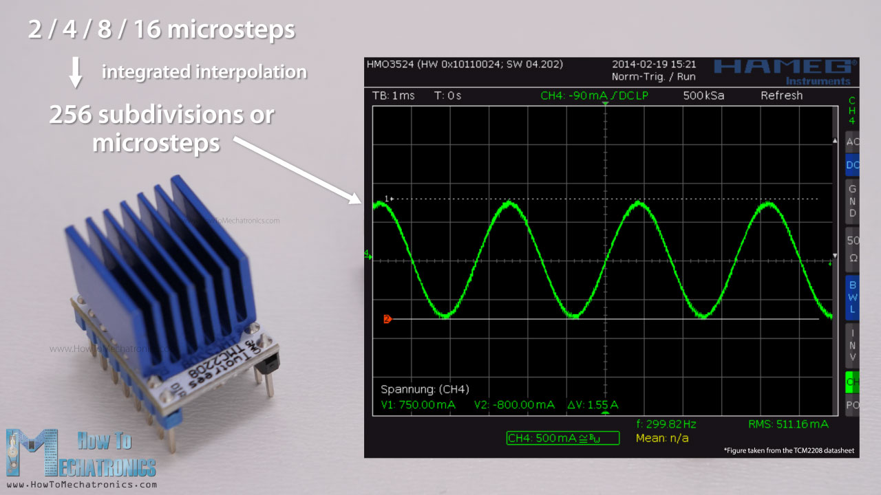 What sets this driver apart from the two others is its integrated interpolation unit which provides 256 subdivisions or microsteps. This allows for perfect sinusoidal control which is generated internally within the chip. This means that the driver will output 256 microsteps to the stepper motor, no matter what microstep resolution we have selected through the two MS pins, 2, 4, 8 or 16 microsteps. This provides smoother operation and reduces the burden of the microcontroller significantly.