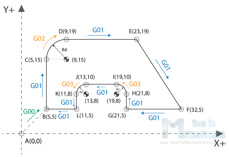 To get the toolpath for the shape shown in the image above we need to following G-code commands:
